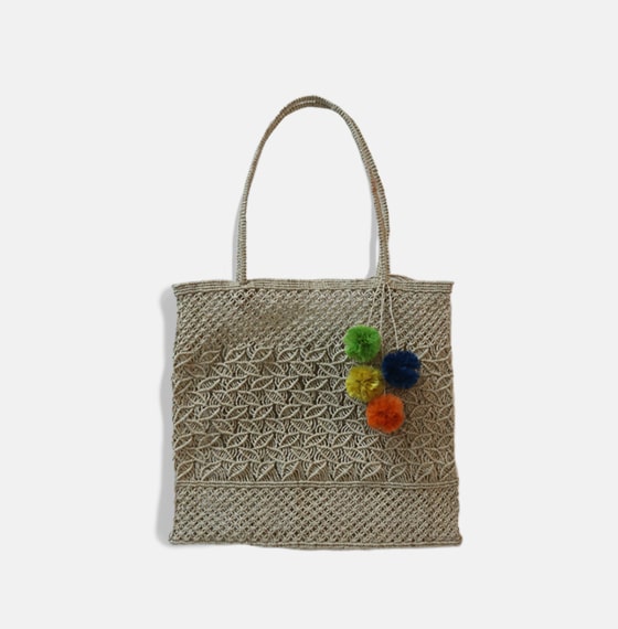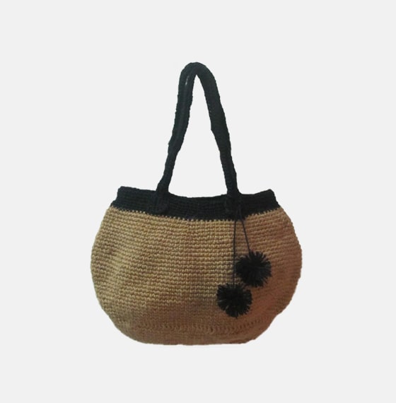 Natural Jute Crochet Bag with Black Handle & Pompon Natural & Black